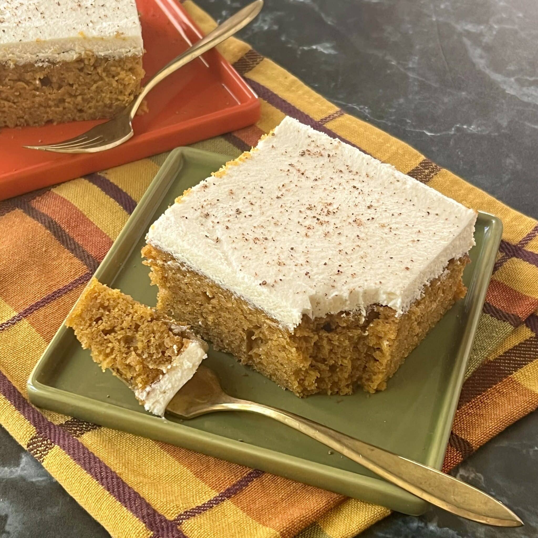 - For frosting: beat together the cream cheese, butter, and vanilla until smooth. Add the powdered sugar and mix until combined. Spread frosting evenly over cake. Cut into desired size bars to serve. Sprinkle the top with grated nutmeg if desired, or with some finely chopped walnuts or pecans, or leave plain.